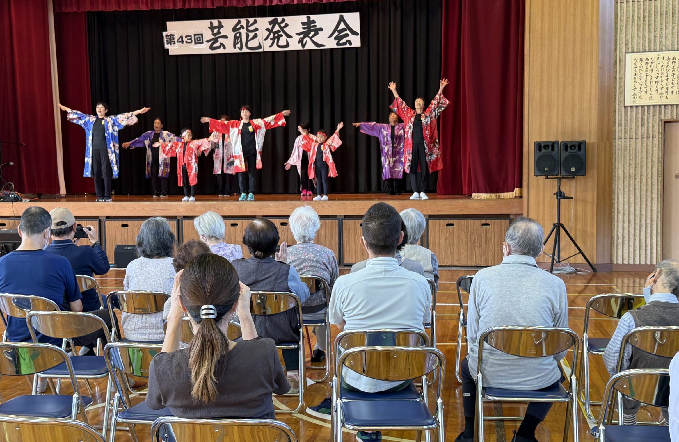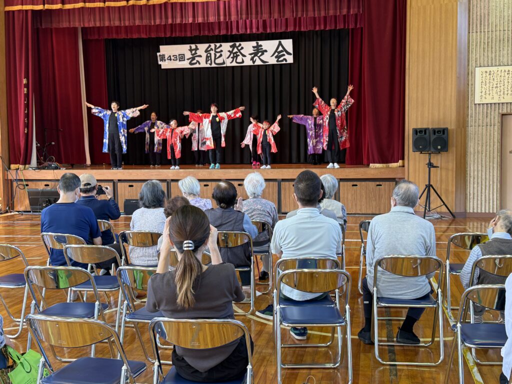 18日に行った芸能発表会は、当初グラウンドで開催予定でしたが、雨模様の予報もあり、体育館で行いました。カラオケにダンスに三味線、教室生の披露、ゲストの演技、どれも日頃の練習・活動の成果を発揮していました。最後には、お客様スタッフ総出で体育館一杯の円になり、南野上音頭を踊りました。今回は、上野さんの生三味線とカラオケ教室の田中先生の生歌で踊りました。この夏に新たに採録した音源ができたを記念して、音源づくりにご参加のお二人が熱演してくれました。