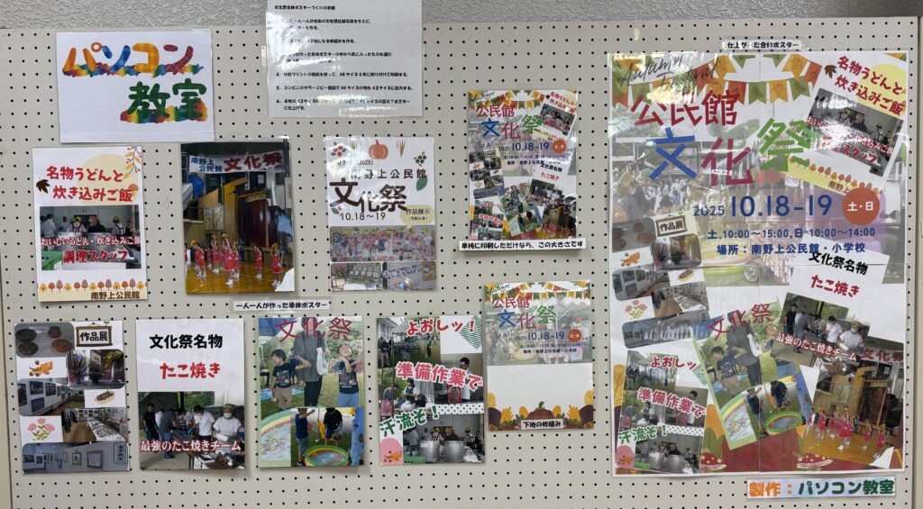 パソコン教室生が作成し文化祭に出品した作品を2階ホールに常設展示しています。