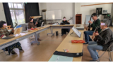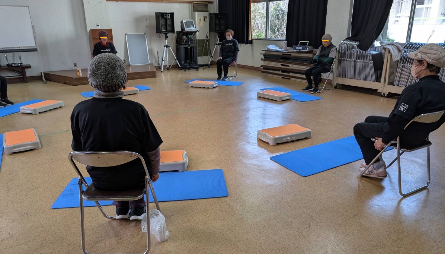 イスを使った脚力トレーニングのようです。ひざに負担が掛からないように屈伸するのですね。各人の前に置いているのは、ステップ運動の用具かな。